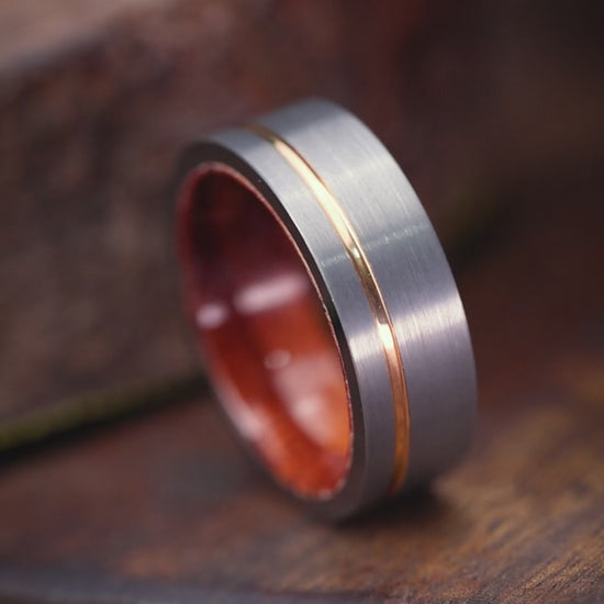 Drawing inspiration from Odysseus, the legendary figure famed for his tenacity, this Desert Ironwood Wedding Band masterfully fuses organic warmth with industrial strength. It features a Brushed Black Tungsten exterior, highlighted by a luxurious Rose Gold Offset Inlay that creates a striking modern contrast.