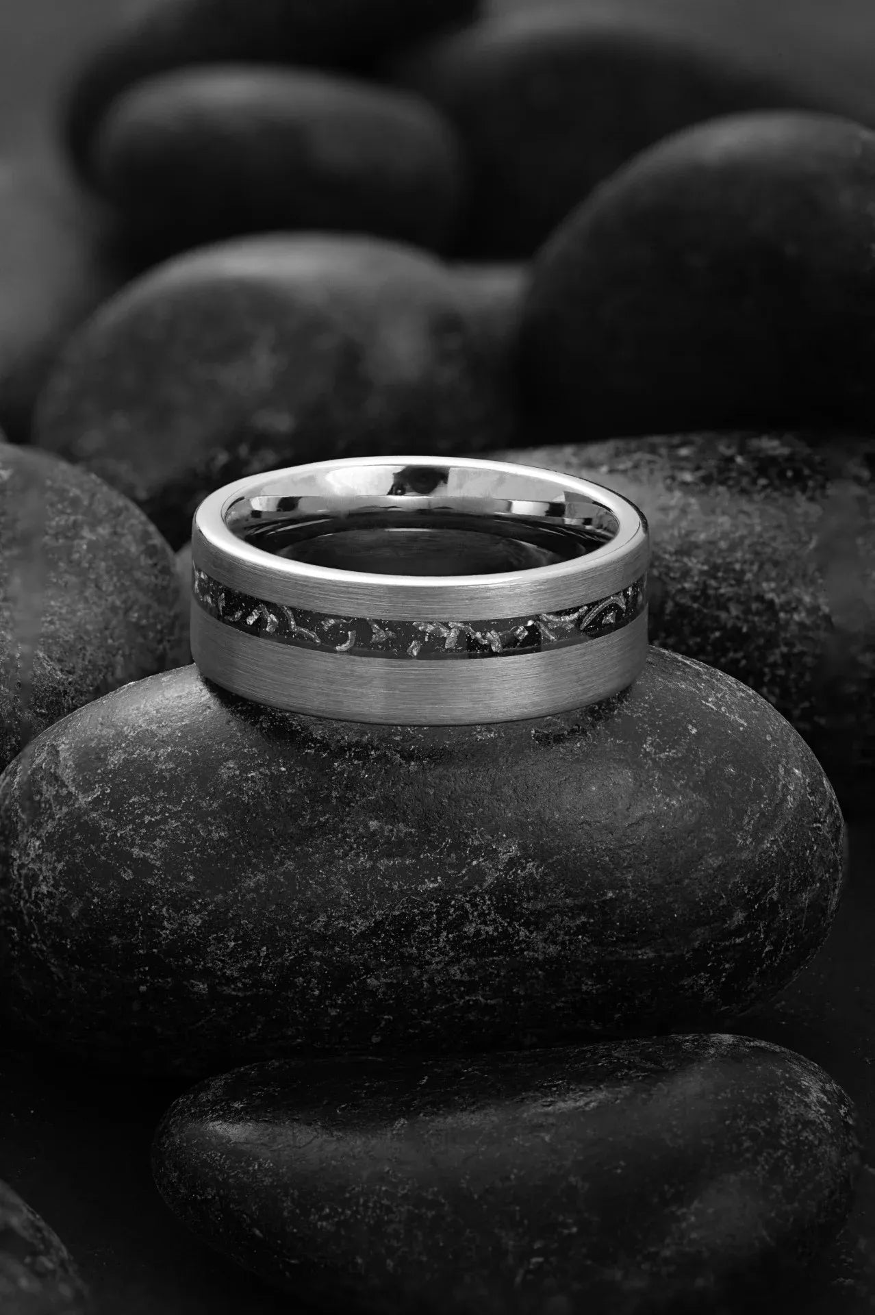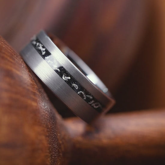 Channel the legendary artistry of Hephaestus with this exceptional silver tungsten ring. Crafted from brushed silver tungsten carbide, it captures the deity's enduring strength and resilience, presenting a commanding modern design. Its distinctive feature is the offset Muonionalusta meteorite inlay, precisely carved from a substantial block of genuine Muonionalusta meteorite, offering a captivating extraterrestrial charm. This fusion of elements honors both the art of craftsmanship and the enduring heritage of cosmic materials, making it a standout choice among our meteorite rings.