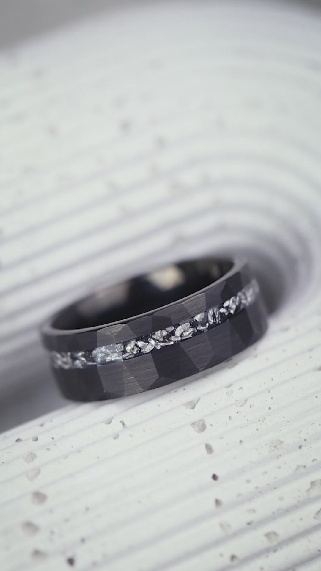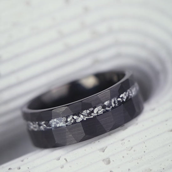 A Union of Earth & Sky The inlay features Crushed Meteorite Fragments, creating a textured, stardust-like appearance that adds cosmic allure to the rugged black band. Handcrafted with care, this Gibeon Meteorite Ring is a standout in our meteorite rings collection. It celebrates the rare union of earthly strength and otherworldly materials. Ideal as a wedding band, it tells a story of passion and adventure—a perfect tribute to a love that is both grounded and extraordinary.