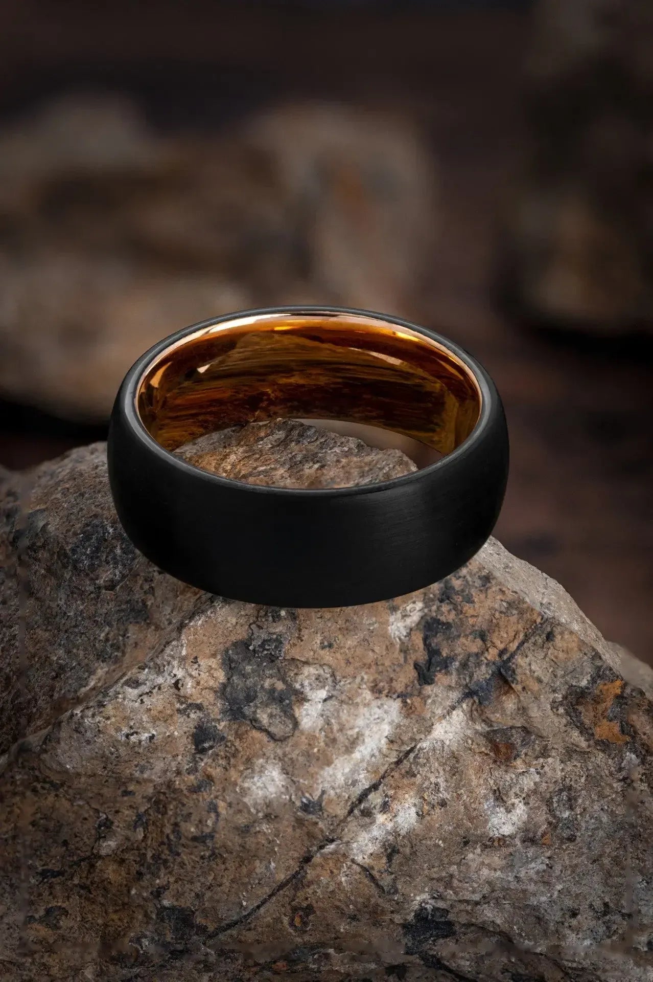 Drawing inspiration from Aquila, the majestic eagle of the skies, this Rose Gold Tungsten Ring commands attention with its stealthy strength and hidden luxury. As a standout in our collection of durable tungsten rings, the design features a modern, Mens Brushed Tungsten Ring exterior that is incredibly scratch-resistant, ensuring the matte black finish remains pristine indefinitely.